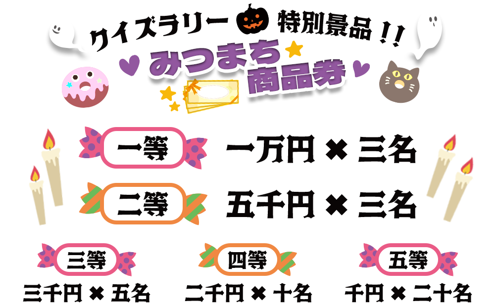 - ●仮装したお子さまに付き添う大人の方は、参加費はいりません(お子さまの分のみお菓子をお配りします)。付き添いの方はお子さまと一緒に(B)三津博クイズコースのクイズラリーにご参加ください。